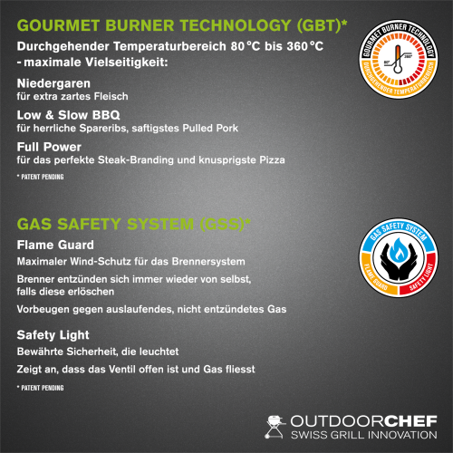Neben Hightech wird auch Sicherheit gross geschrieben – mit dem innovativen Gas Safety System (GSS) wird Grillen mit Gas noch sicherer. Der von OUTDOORCHEF entwickelte Flame Guard schützt die gezündeten Brenner optimal vor Witterungseinflüssen, sodass auch bei niedrigen Temperaturen ab 80 Grad komfortabel gegrillt werden kann – selbst bei Wind. Sollte der Brenner durch starken Wind ausgehen, sorgt der Flame Guard dafür, dass sich das Brennersystem immer wieder aufs Neue von selbst entzündet. Auf diese Weise wird auslaufendem Gas vorgebeugt, das sich sammeln und später ungewollt entzünden könnte. Das im Drehregler integrierte Safety Light steht für bewährte OUTDOORCHEF-Sicherheit: Mit einem Blick erkennt der Nutzer, ob das Ventil offen ist oder zu.
