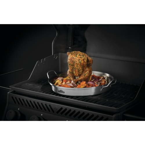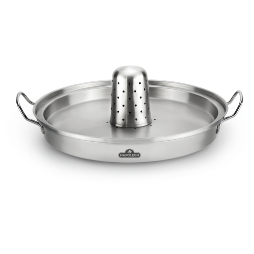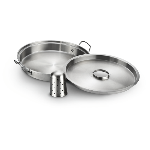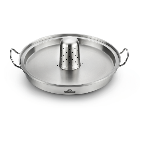 3in1 Geflügelhalter aus Edelstahl, bestehend aus drei Teilen. Einfach abzunehmen und spülmaschinenfest. Anwendung: Flüssigkeit in die untere Pfanne gießen, Deckel einsetzen, darauf kann Gemüse gegart werden. Anschließend den Hähnchenhalter-Aufsatz montieren und das Hähnchen darauf platzieren