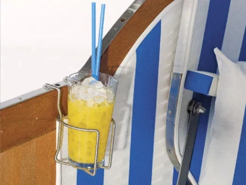 Ein Griff, und schon ist der Getränkehalter sicher am Strandkorb befestigt. Eignet sich für große Tassen und Gläser. Ein praktisches Zubehör, das Platz auf dem Seitentisch schafft.