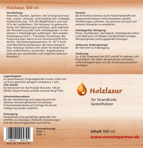 Verarbeitung: Streichen, Tauchen, Spritzen. Der Untergrund muss fett-, wachs-, schmutz- und staubfrei sein. Zulässige Holzfeuchte max. 15% bei Nadelhölzern und max. 12% bei Laubhölzern. Die Holzlasur ist gebrauchsfertig. Vor Gebrauch gut aufrühren, auch während der Verarbeitung oder nach Arbeitspausen. In mindestens 2 Arbeitsgängen aufbringen. Den zweiten Arbeitsgang nach 2 3 Stunden vornehmen. Bei Trocknung über Nacht ist ein Zwischenschliff erforderlich. Verarbeitungstemperatur 15- 30 °C (Luft- und Oberflächentemperatur des Holzuntergrundes). Holzlasur farblos nicht allein für direkt bewitterte Außenflächen verwenden. Angebrochene Gebinde gut verschließen und möglichst bald aufbrauchen. Hinweis: Bei Eichenholz können durch Holzinhaltsstoffe mit wasserverdünnbaren Anstrichsystemen dunkle ­Verfärbungen auftreten. Vorversuche sind auch auf anderen Holzarten zu empfehlen. Arbeitsgeräte, Reinigung: Pinsel, Tauchbecken, Spritzgerät. Arbeitsgeräte sofort nach Gebrauch mit Wasser und Spülmittel reinigen. Reinigungsreste ordnungsgemäß entsorgen. Verbrauch, Einbringmenge: 80-100 ml/m² je Arbeitsgang. Trocknung: Ca. 4 Std. Praxiswert bei 20°C und 65 % relativer Luftfeuchtigkeit. Bei tiefen Temperaturen und hoher Luftfeuchtigkeit kann sich die Trocknung wesentlich verzögern. Lagerfähigkeit: Im geschlossenen Originalgebinde trocken, kühl und vor Frost geschützt gelagert mindestens 1 Jahr. VOC-Gehalt: EU-Grenzwert für das Produkt (Kat.A/e): 130 g/l (2010). Dieses Produkt enthält maximal 40 g/l VOC. Sicherheitskenndaten: Bei der Verarbeitung und Lagerung sind die üblichen Schutzmaßnahmen einzuhalten. Sicherheitsdatenblatt auf Anfrage für berufs- mäßige Verwender erhältlich. Entsorgung: Produktreste sind gemäß den geltenden Vor- schriften zu entsorgen. Entleerte Verpackungen sind den Recyclingsystemen zuzuführen. Kennzeichnung: WGK: 1 ADR: -/-
