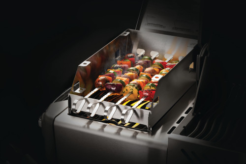 Multifunktionaler Napoleon® Windschutz. Dadurch brennt die SIZZLE ZONE™ auch bei stärkerem Wind stabil. Der Grillrost kann in drei weitere Positionen verstellt werden. Die vordere Blende ist klappbar, so dass der Zugang mit der Grillzange erleichtert wird. Zudem ist eine Spieß-Halterung integriert, die es ermöglicht über der SIZZLE ZONE™ Grillspieße ohne direkten Kontakt zum Rost zu grillen. Für Napoleon® Prestige-, PRO™- und Rogue SE-Serie geeignet.