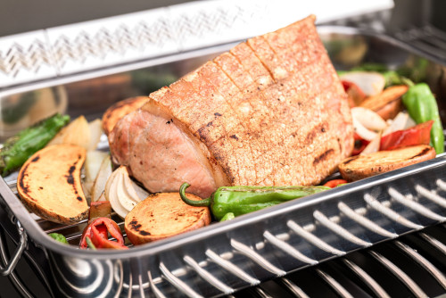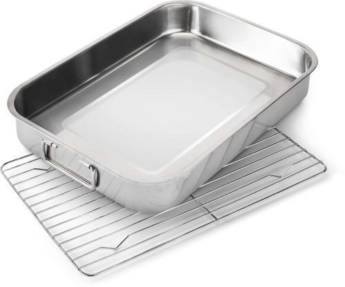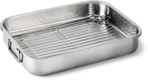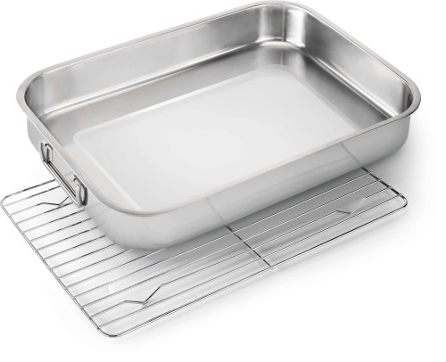 Edelstahl-Pfanne ideal für Braten oder Gemüse. Mit dem Wenderost aus Edelstahl kann überschüssiges Fett vom Gericht getrennt aufgefangen werden. Einklappbarer, ergonomisch geformter Griff. Spülmaschinenfest