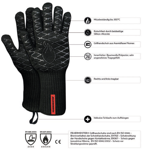 Für den sicheren und rutschhemmenden Griff ist der Handschuh beidseitig mit einer aufwendig aufgebrachten hitzebeständigen Silikonapplikation versehen, welche mittig das exklusive FEUERMEISTER® Marken und Qualitätssiegel trägt. Gleichzeitig sorgt das beidseitig aufgebrachte Silikon für eine ideale Anschmiegsamkeit und der Möglichkeit, den Handschuh sowohl links als auch rechts tragen zu können.