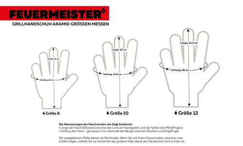 Natürlich kann der BBQ und Grill Handschuh ebenso als Kaminhandschuh, Ofenhandschuh, Backhandschuh und Kochhandschuh verwendet werden. Der Handschuh ist erhältlich in der Größe 8 für Frauen oder kleinere Männerhände, in der Größe 10 für Männerhände und in der Größe 12 für extra große Männerhände (genaue Angaben der Maße entnehmen Sie bitte der Größentabelle in den Bildern).