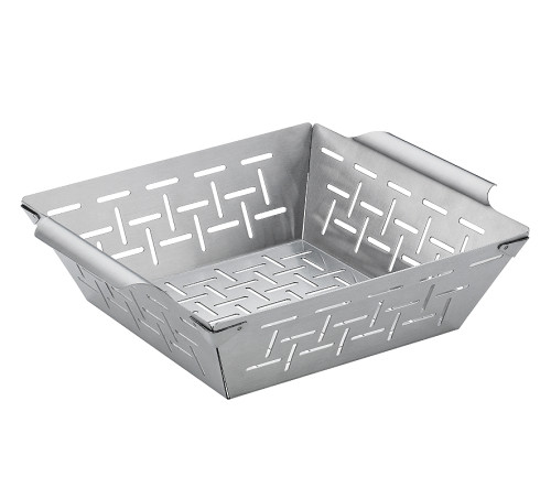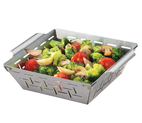 In dem Korb aus robustem Edelstahl garen Brokkoliröschen, Paprikastreifen, Pilze, Tomaten und weitere Gemüsesorten schonend. Geschmack und Biss der bunten Mischung bleiben erhalten, nichts kullert vom Rost. Der praktische Korb ist in zwei Größen erhältlich. Übrigens macht sich auch Obst ganz hervorragend auf dem Grill. Füllen Sie Pfirsichhälften mit zerbröselten Amarettini und einem Klecks Frischkäse, kleiden Sie den Gemüsekorb mit Alufolie aus und setzen die goldgelben Früchte hinein. Lecker!