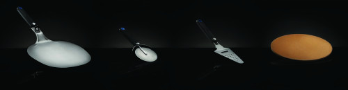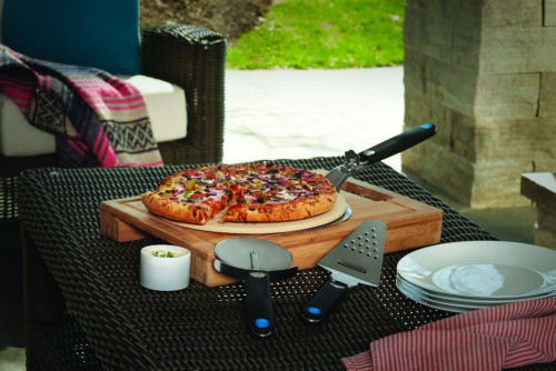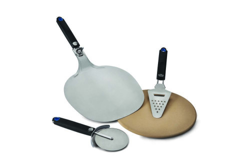 Napoleon® Starter Kit „Pizza Liebhaber“. Beinhaltet einen Pizza-Stein (Ø 34,3 cm ), einen Pizza-Heber mit klappbarem Griff, einen extragroßen Pizza-Schneider sowie einen Käse-Raspel und -schneider.